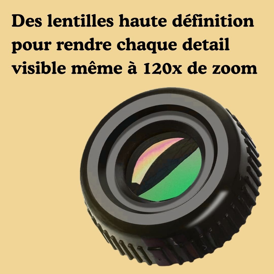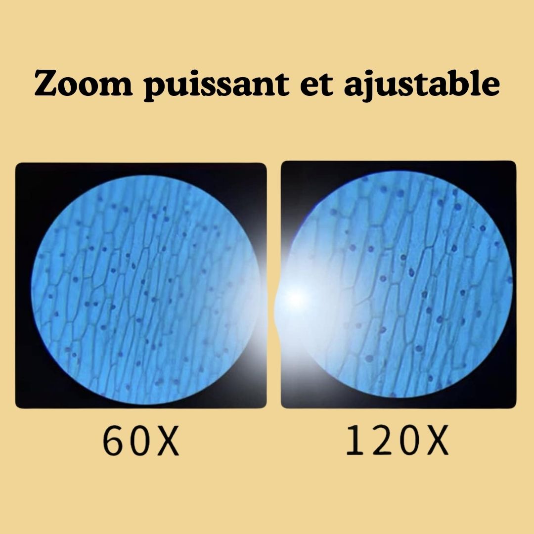 Le télescope MicroMonde offre un zoom ajustable de 60x à 120x, permettant d’observer avec précision insectes, feuilles, tissus, pièces de monnaie et bien plus encore.